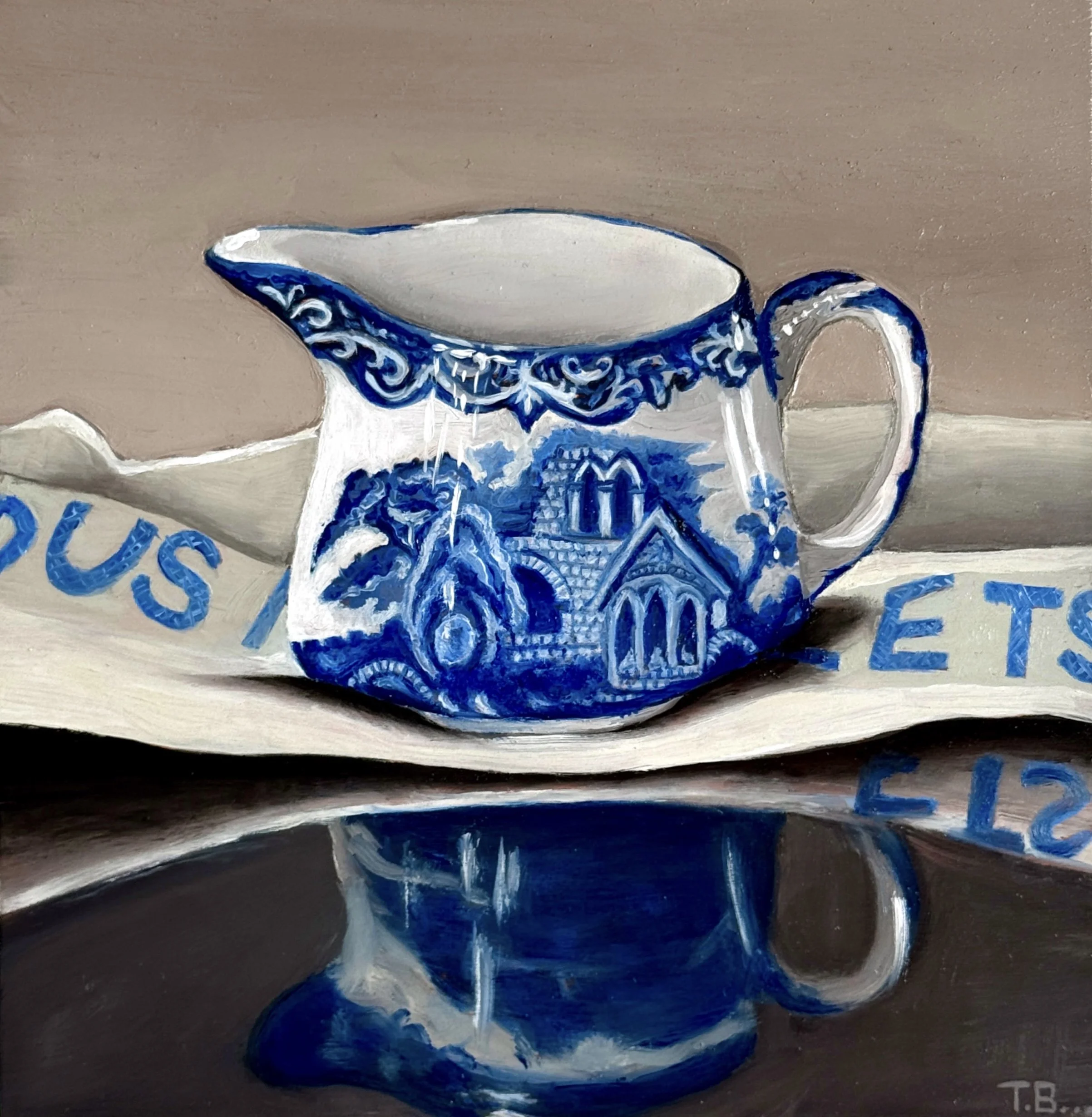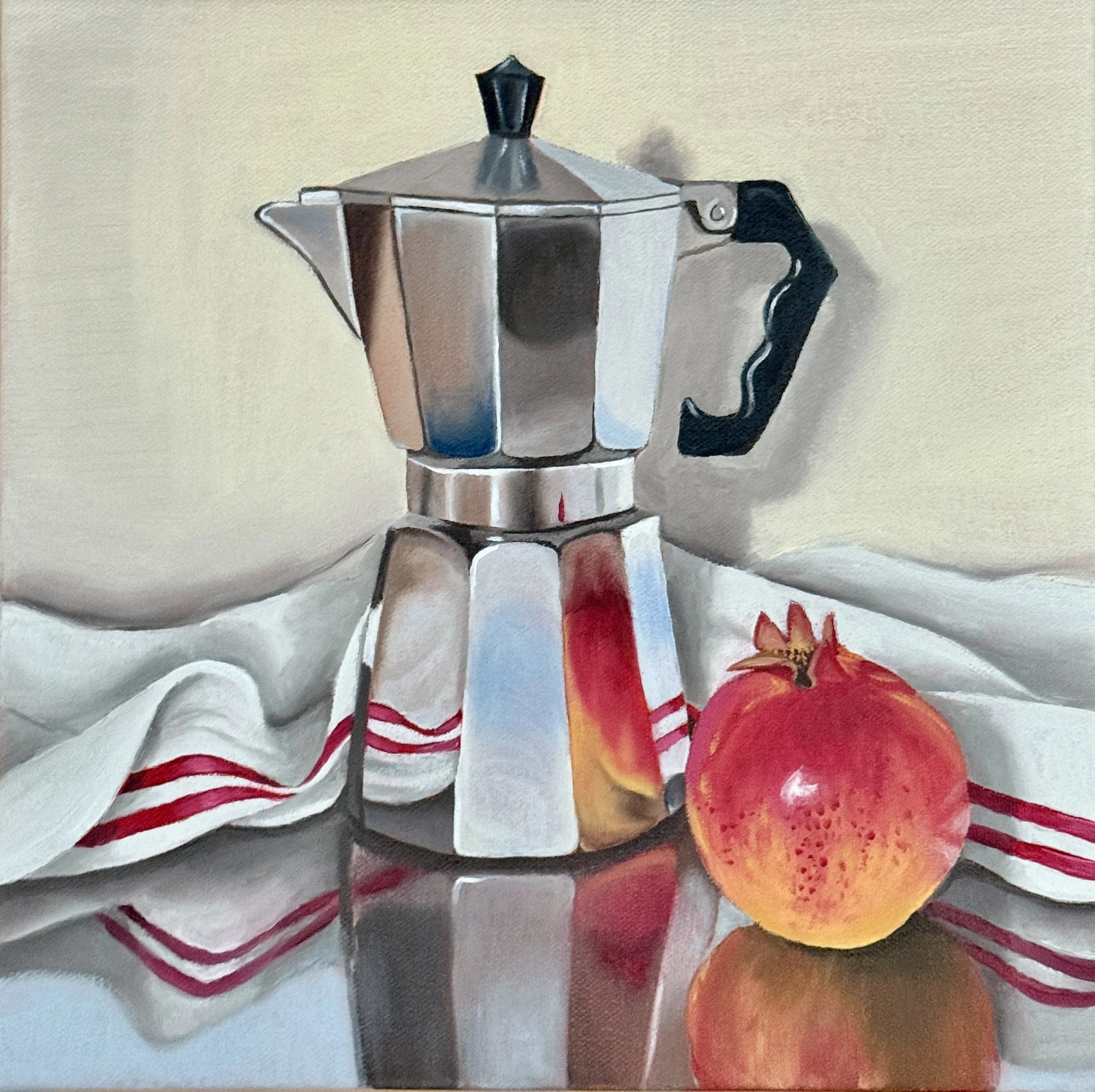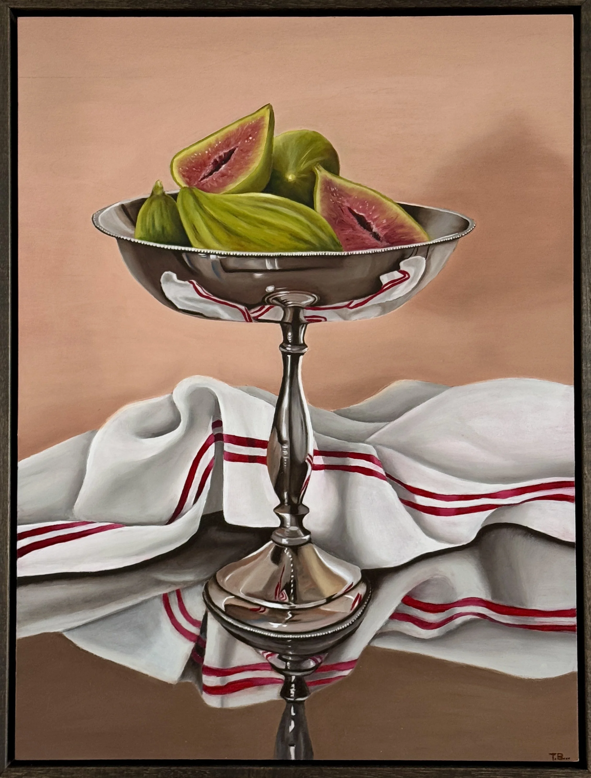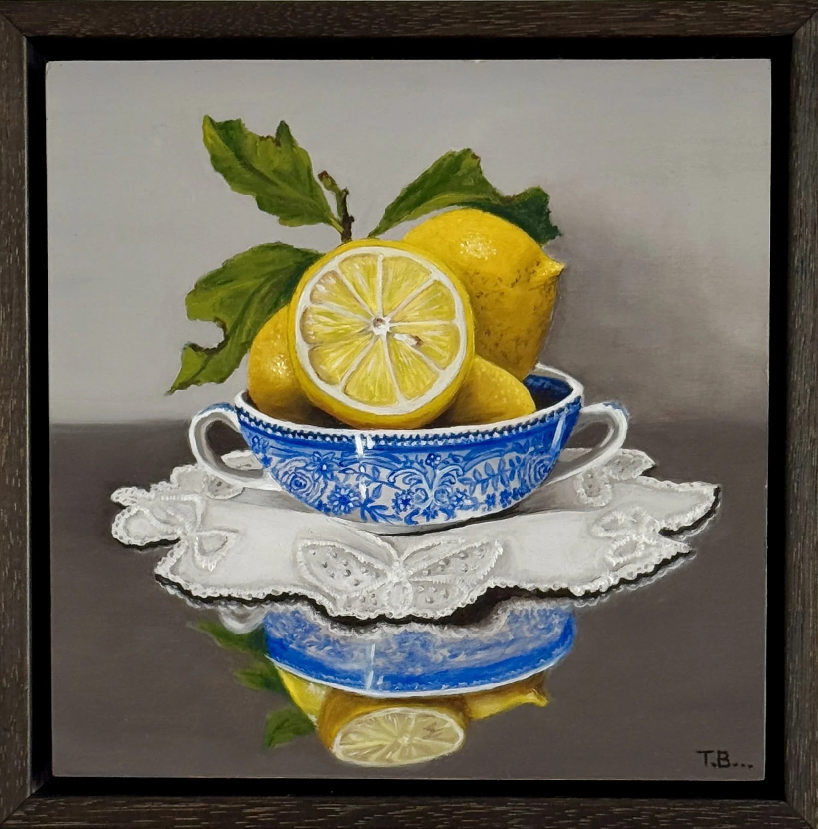 Tina uses several subjects and loves experimenting and challenging herself in her still-life paintings. She loves grouping objects to create a story and a snapshot of a point in time, often using old treasures she has thrifted or saved from being discarded. Giving life to these sometimes overlooked objects is something that gives her a lot of joy. Tina has an extensive collection of tea towels, which are often included in her paintings. Oils are her medium of choice, as she loves the richness of this medium.